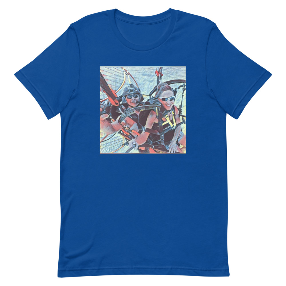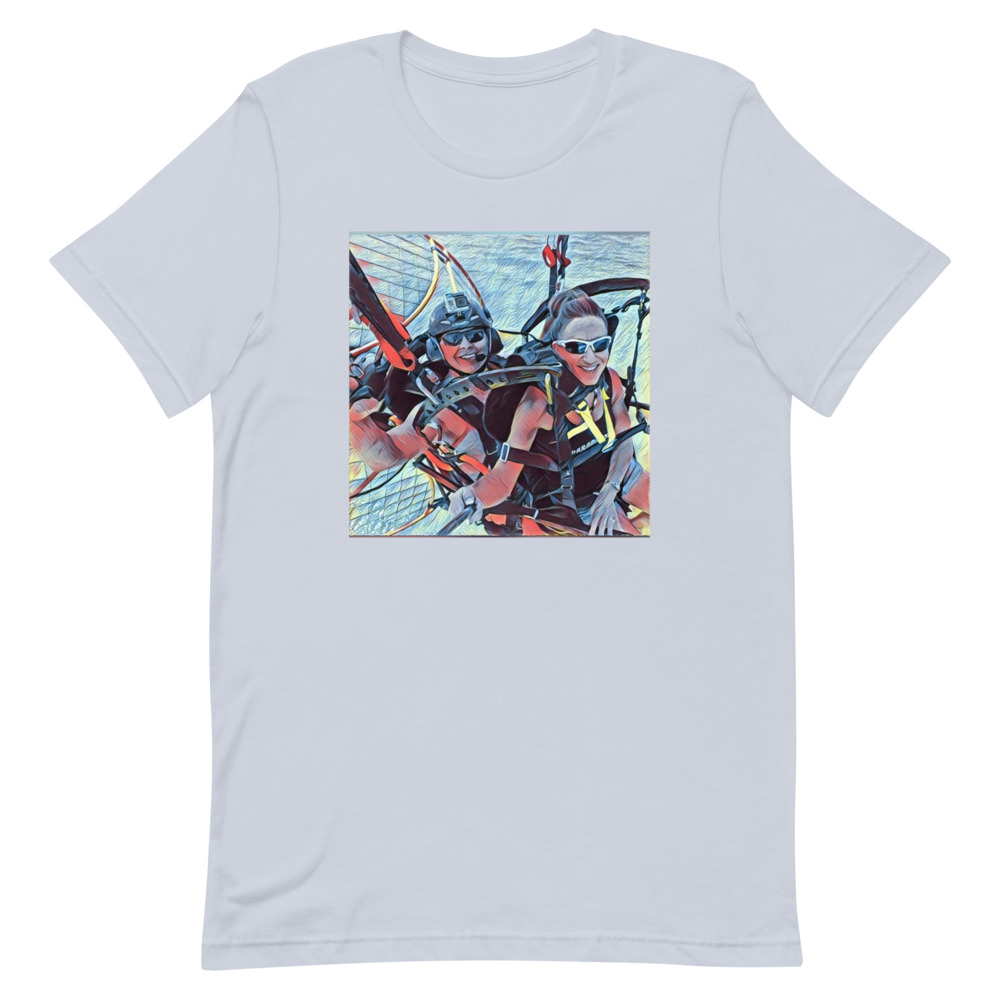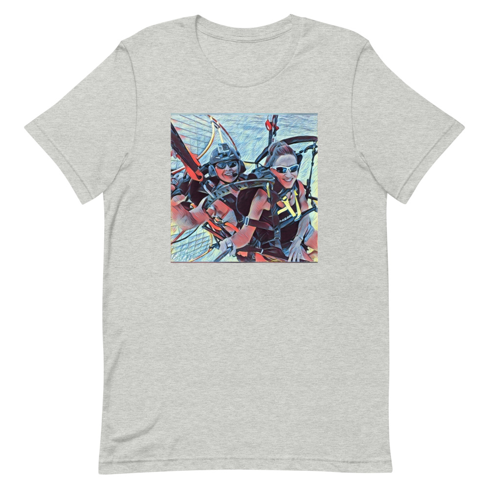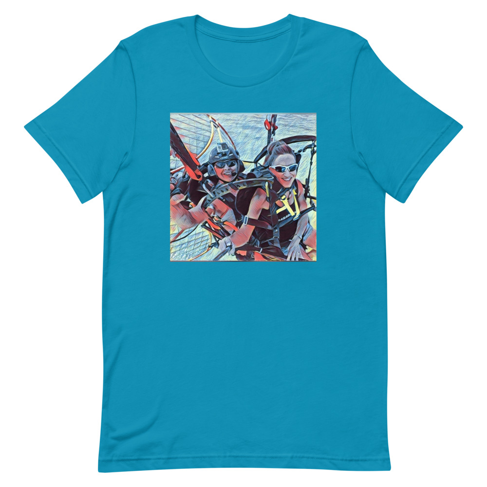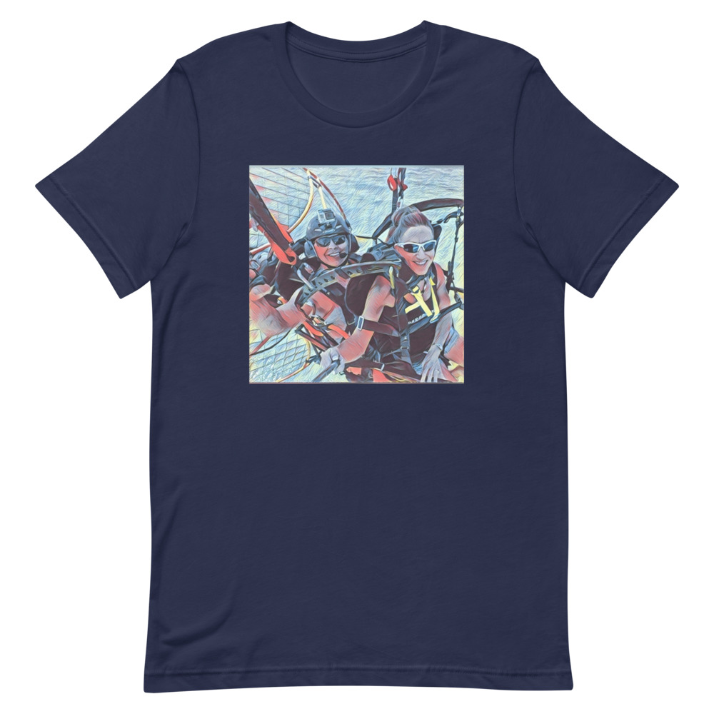 This is the Tandem fun Short-sleeve unisex t-shirt. It expresses the joy of tandem paramotoring. Flying in Tandem is a lot of fun.
