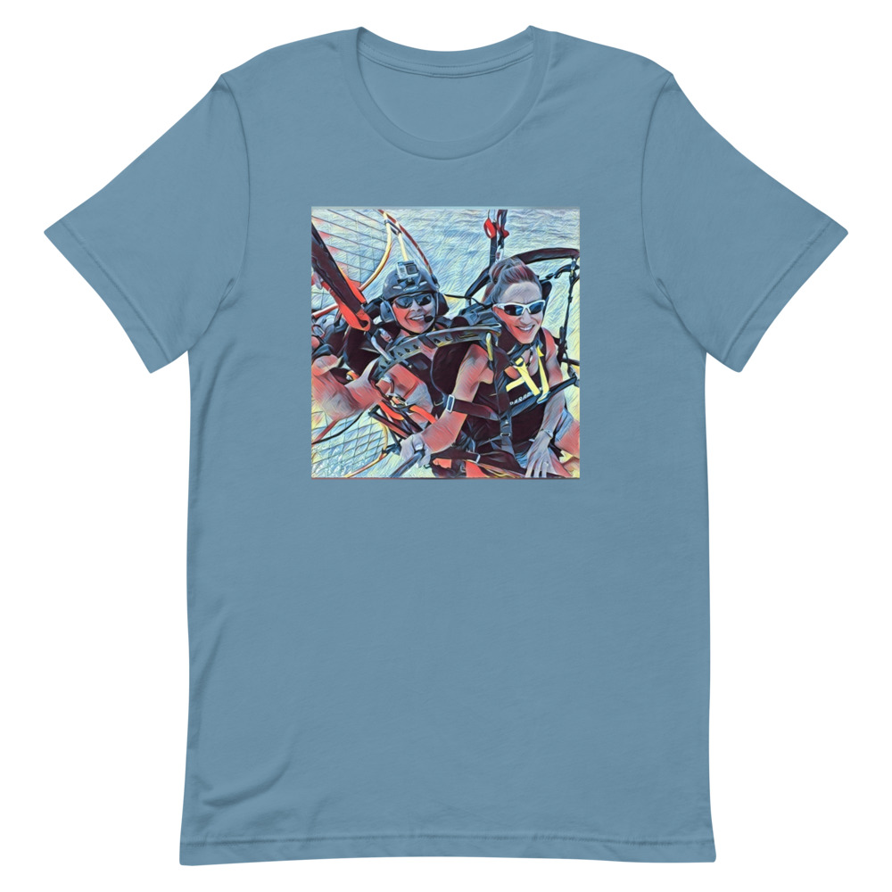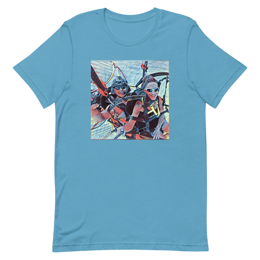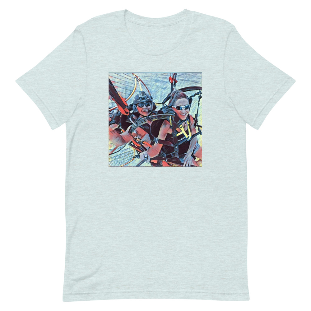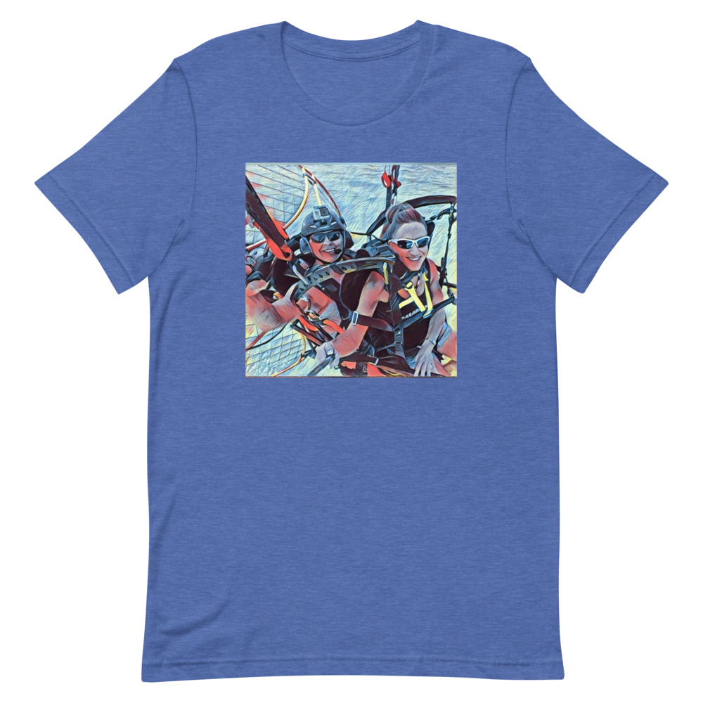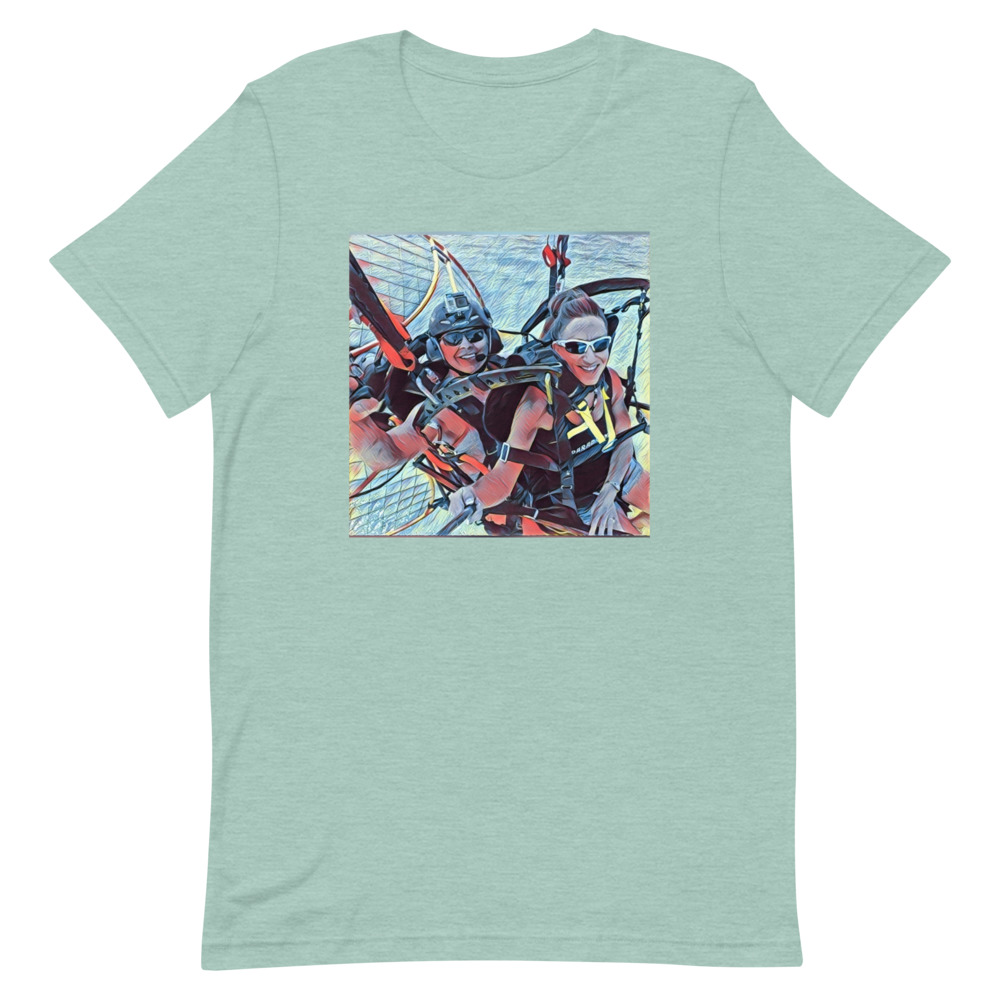 This is the Tandem fun Short-sleeve unisex t-shirt. It expresses the joy of tandem paramotoring. Flying in Tandem is a lot of fun.